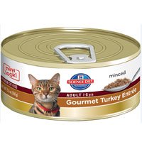 Tempt your cat with the terrific taste of turkey in Hill?s Science Diet Adult Minced Gourmet Turkey Entr?e Canned Cat Food. Not only is it flavorful, satisfying and made with real turkey, it?s also loaded with specific proteins, vitamins and minerals that all adult cats need so that they can look and feel their best. Hill?s Science Diet Adult Minced Gourmet Turkey Entr?e Canned Cat Food is just what your cat needs to be healthy and strong.