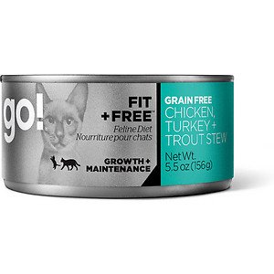 Go! Fit + Free Grain-Free Chicken, Turkey & Trout Stew Canned Cat Food, 5.5-oz, case of 24; Introducing the all new Go! Fit + Free Grain-Free Chicken, Turkey & Trout Stew, guaranteed to put a little extra bounce in your cat's step. Go! Fit + Free recipes have the most meat of any Go! recipe. A protein-rich, lower carb diet helps your cat stay strong, healthy and fit. Key Benefits