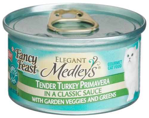 Elegant Medleys from Fancy Feast creates restaurant inspired food for cats so that every member of the family can dine well. Italian-inspired Tender Turkey Primavera is a primavera-style recipe with tender bits of turkey in a classic sauce accented with garden veggies and greens. In addition to including real meats and vegetables, Elegant Medleys is vitamin and mineral fortified to keep your kitty healthy. Simple to serve, right out of the can, Elegant Medleys provides adult cats and kittens with the experience of a well balanced meal and a delectable taste your cat will love.Feeding Recommendations: Feed an average size adult cat 1 can per 2-1/2 pounds of body weight daily. Feed up to twice this amount to kittens.