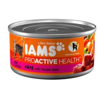 Iams(R) ProActive Health Adult Premium Pate Canned Cat Food Case 24 Pack Iams(R) ProActive Health Adult Premium Pate Canned Cat Food gives your cat the taste and nutrition of a homemade meal. Made with real broth in every healthy bite, your cat will find mealtime irresistible. Iams(R) ProActive Health Adult Premium Pate is made from natural ingredients slow-cooked in real broth with added vitamins and minerals. The best part is, Iams(R) ProActive Health is made right here in the USA. Features: Made in the USA Taste and nutrition of a homemade meal Made from natural ingredients slow-cooked in real broth with added vitamins and minerals Item Specifications: Sizes: 24-3 oz. cans 12-5.5 oz. cans Flavors: Tender Beef Gourmet Chicken Lamb & Rice Country Style Turkey and Giblets Recommended For: Adult cats over the age of 1 year Tender Beef Guaranteed Analysis: Crude protein (min):10.0% Crude fat (min):5.5% Crude fiber (max):0.5% Moisture (max):78.0% Ash (max): 2.75% Magnesium (max): .025% Taurine (max): .05% Omega 6 Fatty Acid* (min): 0.8% Omega 3 Fatty Acid* (min): 0.1% Tender Beef Ingredients: Beef Broth, Chicken, Meat By-Products, Chicken By-Products, Beef, Natural Flavors, Brewers Rice, Broccoli, Carrots, Dried Beet Pulp, Flax Meal, Sweet Potatoes, Caramel, Guar Gum, Suncured Alfalfa, Potassium Chloride, Brewers Dried Yeast, Dried Egg Product, Minerals (Zinc Oxide, Manganese Sulfate, Copper Sulfate, Potassium Iodide), Choline Chloride, Carrageenan, Vitamins (Vitamin E Supplement, Niacin, Thiamine Mononitrate (source of vitamin B1), Vitamin A Acetate, Calcium Pantothenate, Biotin, Pyridoxine Hydrochloride (source of vitamin B6), Vitamin B12 Supplement, Riboflavin Supplement (source of vitamin B2), Vitamin D3 Supplement, Menadione Dimethylpyrimidinol Bisulfite (source of vitamin K3), Folic Acid), Fructooligosaccharides, Taurine, Salt Gourmet Chicken Guaranteed Analysis: Crude protein (min):10.0% Crude fat (min):5.5% Crude fiber (max):0.5% Moisture (max):78.0% As