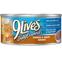 9Lives Turkey & Giblet Dinner 24-5.5-oz cans The great meaty tastes of 9Lives Ground Turkey & Giblets Dinner canned cat food is always a classic and is better than ever. With so many different varieties to choose from, mealtime will always be exciting. Feed an adult 6-8 lb. cat or 3 lb. kitten one can twice per day. Adjust as necessary for your cat's age and activity. Ingredients: MEAT BY-PRODUCTS, WATER SUFFICIENT FOR PROCESSING, TURKEY, POULTRY BY-PRODUCTS, GIBLETS, FISH, TURKEY BROTH, STEAMED BONE MEAL, GUAR GUM, TITANIUM DIOXIDE, SALT, POTASSIUM CHLORIDE, SODIUM TRIPOLYPHOSPHATE, NATURAL FLAVOR, CHOLINE CHLORIDE, CARRAGEENAN, VITAMINS (VITAMIN E SUPPLEMENT, VITAMIN A SUPPLEMENT, THIAMINE MONONITRATE, NIACIN SUPPLEMENT, D-CALCIUM PANTOTHENATE, RIBOFLAVIN SUPPLEMENT, PYRIDOXINE HYDROCHLORIDE, MENADIONE SODIUM BISULFITE COMPLEX, VITAMIN D3 SUPPLEMENT, FOLIC ACID, BIOTIN, VITAMIN B12 SUPPLEMENT), MINERALS (MAGNESIUM OXIDE, FERROUS SULFATE, ZINC OXIDE, MANGANOUS OXIDE, COPPER SULFATE, CALCIUM IODATE, SODIUM SELENITE), TAURINE, SODIUM NITRITE (TO PROMOTE COLOR RETENTION). Guaranteed Analysis %: Moisture (max) 78 Crude Protein (min) 9 Crude Fat (min) 4.5 Ash (max) 4 Crude Fiber (max) 1 Taurine (min) 0.05Read more 9Lives Turkey & Giblet Dinner Canned Cat Food 24-5.5-oz cans