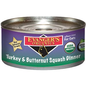 Evangers Organic Turkey & Butternut Squash Dinner Canned Cat Food, 5.5-oz, case of 24; Made with Evanger's same superior quality, this product utilizes certified organic ingredients so that your feline can enjoy a long and healthy life! Key Benefits