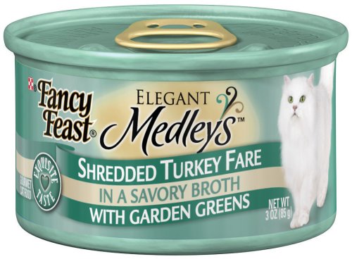 Product Description : Fancy Feast Gourmet Cat Food, Shredded Turkey Fare in Broth with Garden Greens, 3-Ounce Cans (Pack of 24)