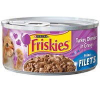 A premium canned cat food Made with real meat turkey cut into moist filets in a rich gravy Complete and balanced nutrition for kitten growth and adult cat maintenanceRead more Friskies Prime Filets Turkey Dinner In Gravy Canned Cat Food